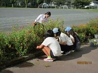 会瀬小は朝から児童の活動が見られます。栽培委員会が花がら摘みをしています。1年生はアサガオに水やりです。