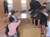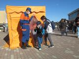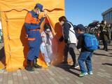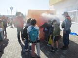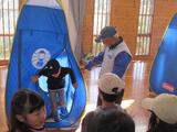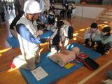避難完了後は防災体験活動を行いました。防災訓練体験ブースを6箇所つくり、煙道体験、AEDによる救護訓練、消火訓練等を体験しました。
