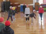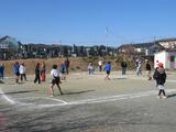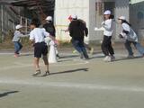 5年生のところへ行くと、ドッジボールのようなラインが引かれ、カラーコーンの上に紅白帽が載っていました。