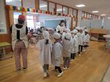 ちょっと大きめの白衣を着て、給食当番が整列しました。