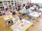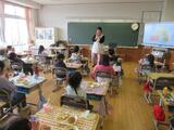 教室で、給食の進め方やきまりについておはなしを聞いた後、